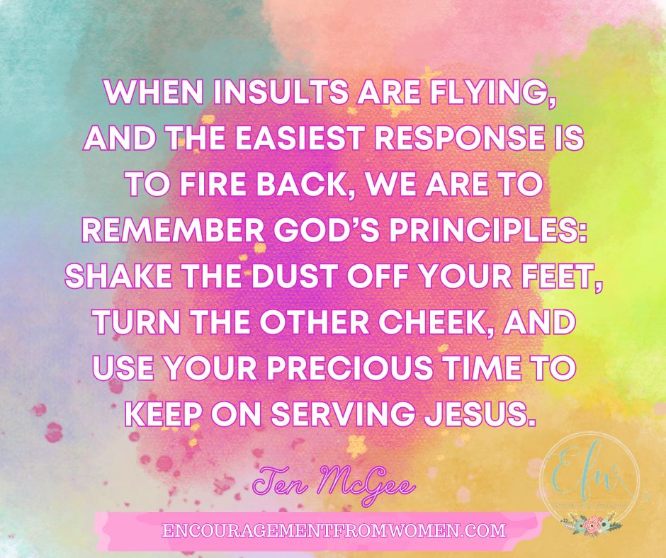 When insults are flying, and the easiest response is to fire back, we are to remember God’s principles: Shake the dust off your feet, turn the other cheek, and use your precious time to keep on serving Jesus.