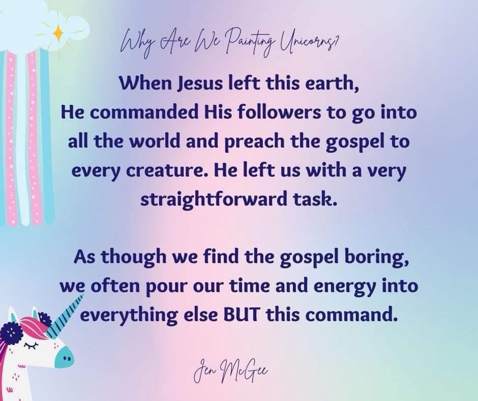 Oh, how distracted we have become! We will do anything and everything but the job we’ve been tasked with by our Master. When is the last time we have intentionally set out to share the gospel with the lost? When is the last time we’ve taken someone under our wing and discipled them? Jesus is coming back soon. God forbid He come back and find us painting unicorns. Lord, forgive us. May we never grow weary or bored with Your simple assignment of reaching and discipling lost souls for You.